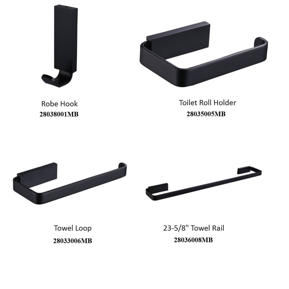 Robe Hook 28038001MB, Toilet Roll Holder 28035005MB, Towel Loop 28033006MB, 23-5/8" Towel Rail 28036008MB