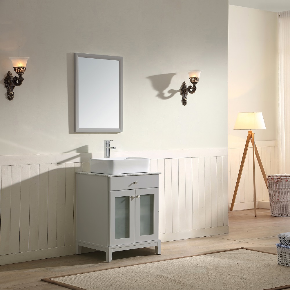 Features: Self Soft Closing Hinges; 2 Doors with Frosted Glass Panels; One shelf inside the cabinet; One Drawer;